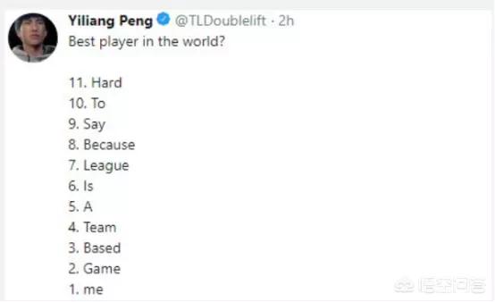 然后把回答分成了一个排名:LOL是一个团队游戏,没办法去评价。但在最后,却非常调皮的加了一个我,显然是在说自己才是世界上最好的选手,哪怕是曾经将他按在地上摩擦的Uiz都不行! 其实大师兄是一位美籍华裔,又因为骚话不断才被中国玩家所关注,他在北美是同我们厂长一样的存在,S1开始打职业 化石级别的选手,说他是北美第一ad倒是没人反驳,但确实同当今正如日中天的Uzi来比,确实称不上世界最强。