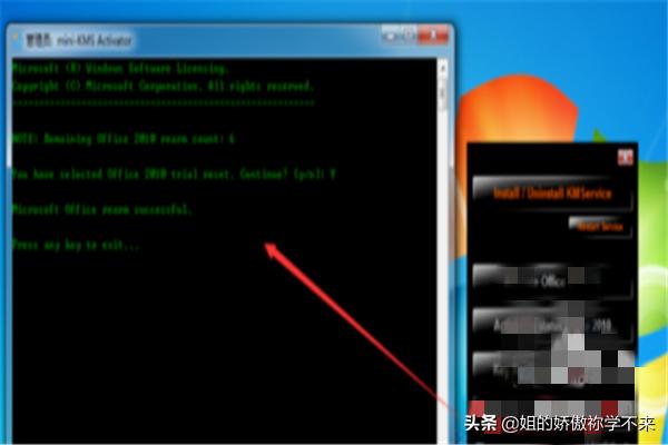 5、点击“Rearm office 2010”,在弹出CMD的窗口中输入“Y”,出现“Press any key to exit ......”按任意键退出。如下图所示: