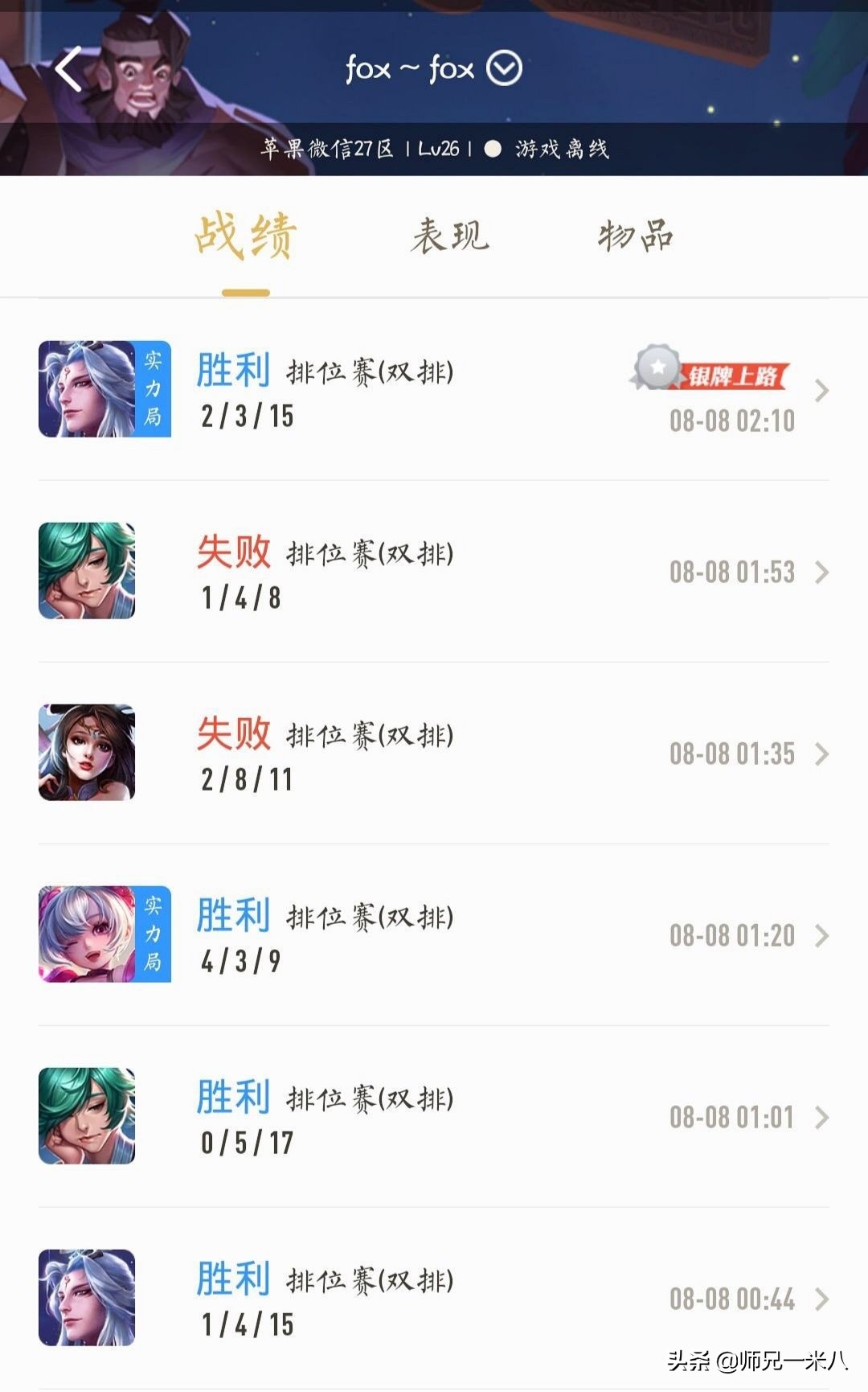但杨幂并不是只有这么一个号,她还有另外的小号,点进他第2个小号(黄金1段位),查看她的比赛记录发现跟某一个人从8月7号下午3:50多,一直到8月8号凌晨2点10几乎一直双排!