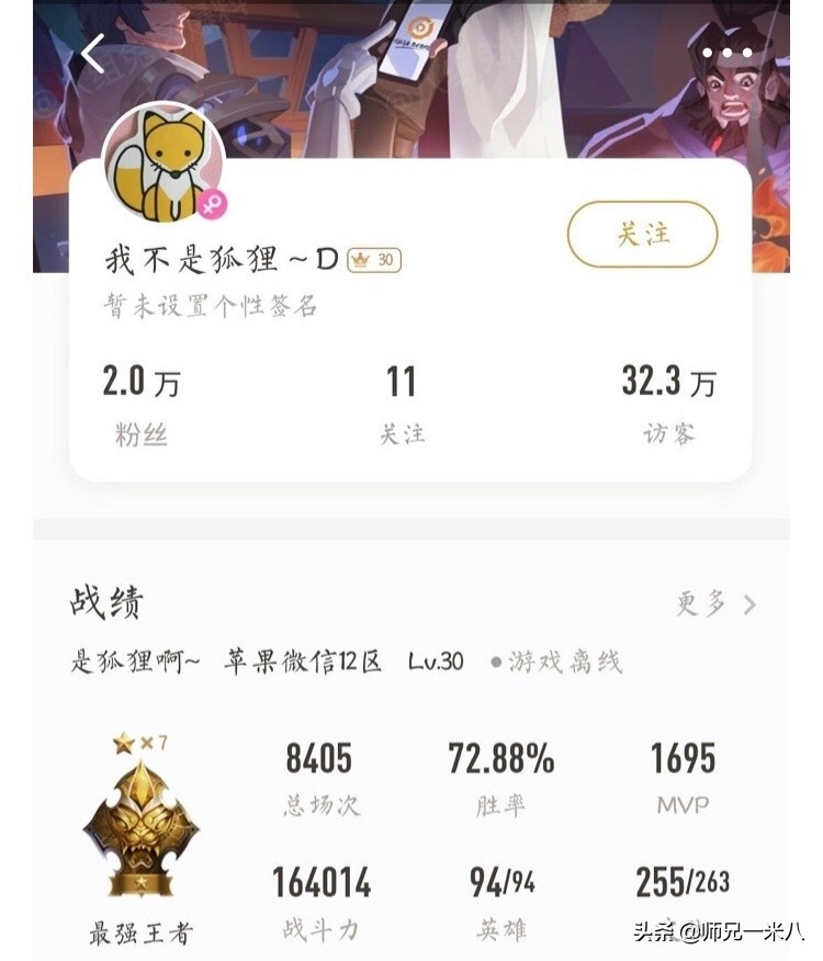 这个账号是杨幂的王者大号,目前是王者7星的水平,胜率接近73%,皮肤还差8个就凑齐了,可以说非常的厉害了!