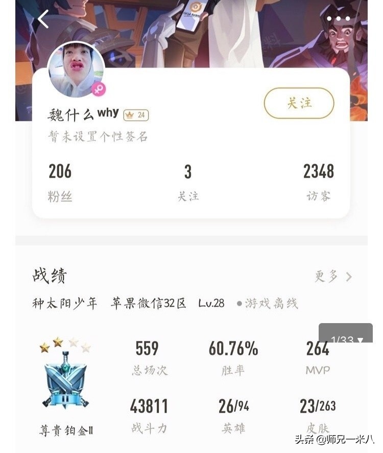 王者主页号就是他的微信号,而头像呢,也是他本人的微信头像。魏大勋才玩589场,段位铂金2,看来并不是一个王者荣耀重度粉丝。