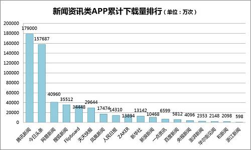 图片展示的是最近一年新闻类 APP 的总下载量,可以看到排名前三的是腾讯新闻、今日头条、网易新闻。
