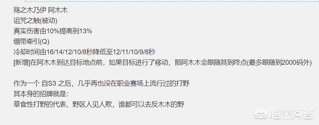阿木木改动:被动的真实伤害由10%变为13%;Q技能冷却时间由16-14-12-10-8变为12-11-10-9-8,新增机制:在木木到达目标所在地点之前,倘若目标进行了移动,木木会跟随他移动。(最大移动距离2000码)这些改动最主要的还是Q技能的跟随,大致的意思就是,如果你在Q中敌方英雄时,但是还未飞到对面脸上,这时对面用闪现,或者是EZ的E,狼人的大招等等位移技能时,你会跟随他们一同移动。注意,木木Q技能的眩晕依旧是存在的。举几个特例:塞恩开大免控,所以木木Q中他时,木木将会搭上塞恩的顺风车,随其一直移动,直至贴脸后停止。
