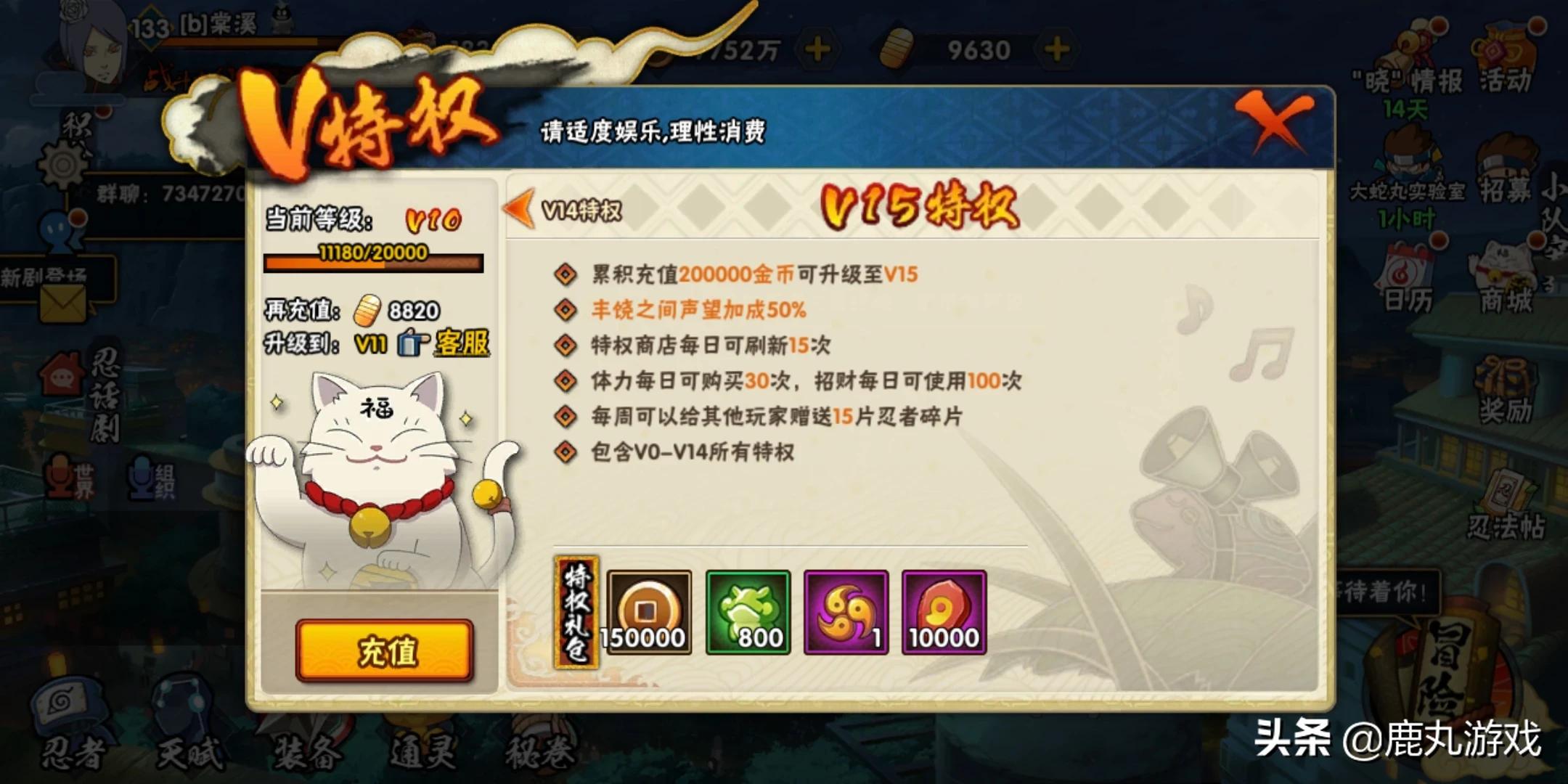1.V贵族是通过充值获得的一个特权等级,充值得越多,V等级就越高,也会在游戏内获得相应的特权,火影忍者手游是一款角色扮演类格斗游戏,2016年上线至今,好评不断,也获得了大量火影粉丝的认可。