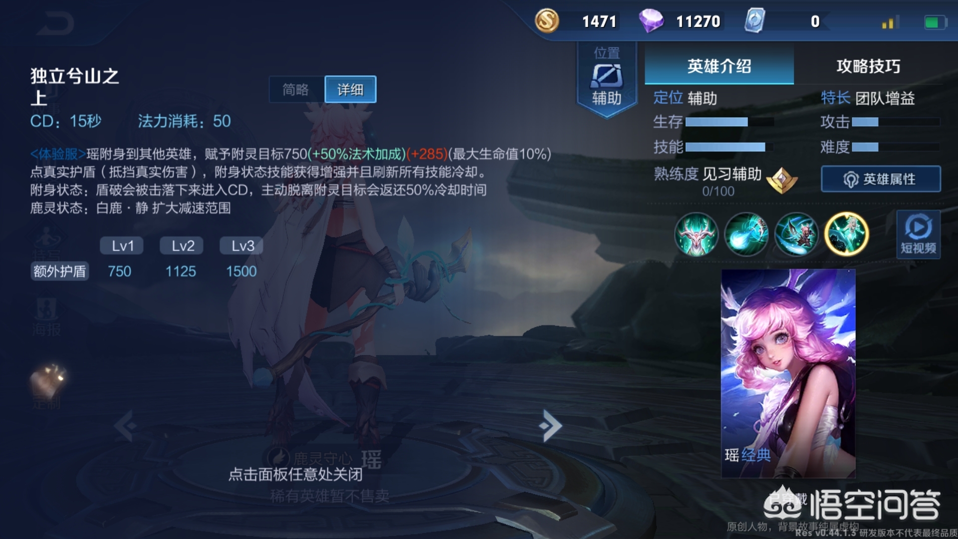 独立兮山之上:瑶附身到其他英雄,赋予附灵目标真实护盾(抵挡真实伤害),附身状态技能获得增强并且刷新所有技能冷却。附身状态:主动脱离附灵目标并返还部分冷却时间 鹿灵状态:减速范围内敌人移动速度。
