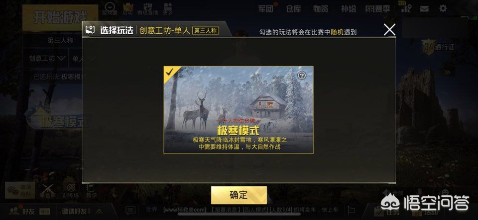 极寒模式,顾名思义就是在雪地地图中会出现暴风雪天气,除此之外没有其他的改变,不过对于玩家们来说,可能比赛要更为紧张一些了,因为需要收集各种物资来保证自己可以生存下来。而“极寒模式”是独立于其他所有模式的,需要从“创意工坊”里单独进入,并且该模式是会计算到排位分数里的。