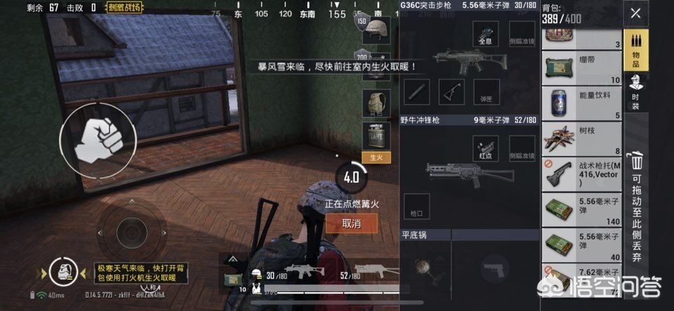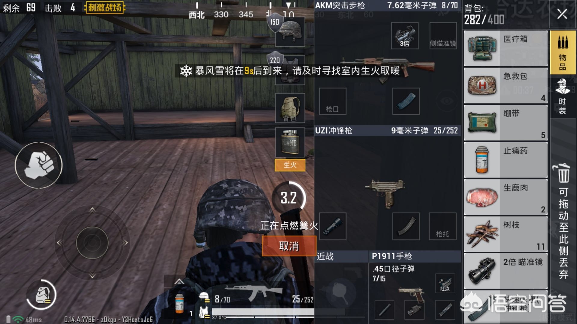 在暴风雪来临前,你有1分钟的时间寻找房屋来躲避寒冷,然后在暴风雪来临时就需要打开背包来生火取暖了。注意,在第一轮暴风雪来的时候会用到5个树枝,所以大家一定要保证在落地后的几分钟里找到5个树枝才行,不然就有可能因为树枝不够而导致自己被冻死了。