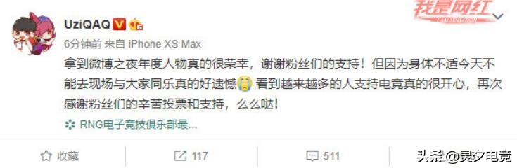 灵夕看见UZI拿到微博之夜年度人物后,就开始幻想UZI走红毯的样子了,但是UZI说自己因为身体原因去不了,这个就有点可惜了。这两年世界赛后UZI都会选择休息,年后的德玛西亚之杯都不参加。灵夕也希望UZI好好休息,明年剑指S10,加油。