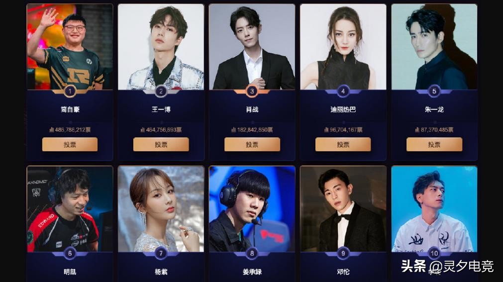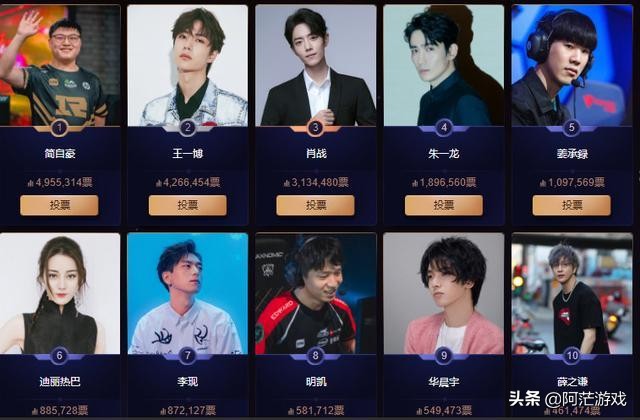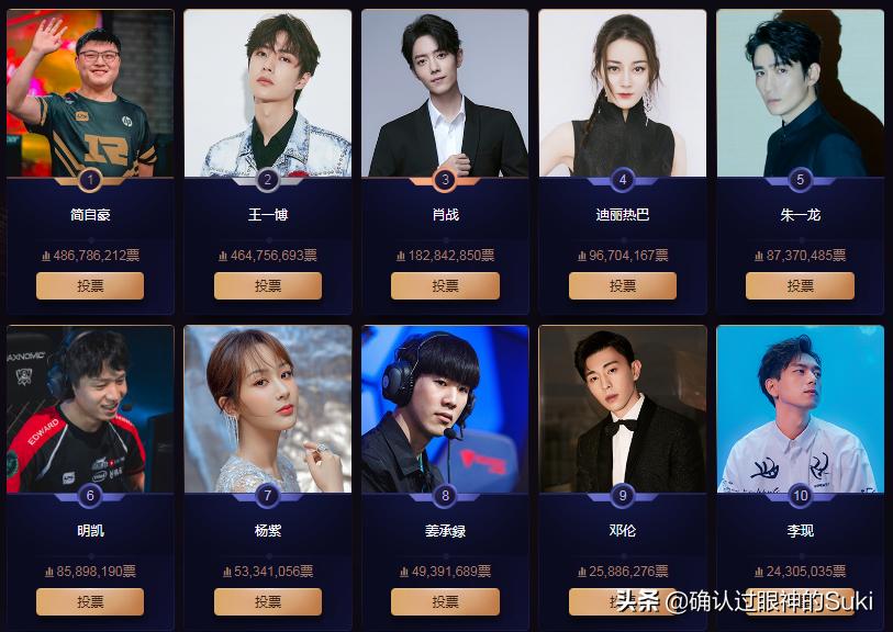 我们可以看到Uzi的票数和第二名王一博,简直是不分上下,说实话电竞圈能超越娱乐圈大咖,估计只有Uzi一个人能行,看看前十名只有三位电竞圈的人。分别是RNG战队的Uzi、EDG战队的明凯和IG战队的Theshy,小狗真的是电竞圈的骄傲,人气的代表,可惜始终无缘世界冠军,估计这也是他的致痛点。