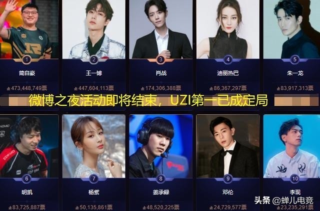 今年的微博年度人物活动,因为Uzi、厂长、TheShy等LPL职业选手的加入而备受电竞圈内人关注,以往,这种类似的活动都是娱乐圈的明星和体育界的翘楚参加,但今年不同,随着电竞在国内越来越受关注,很多电竞职业选手也成了家喻户晓的明星,尤其是Uzi,人气要比一般的二线明星高很多,在这次的年度人物活动中,Uzi更是力压各路小鲜肉,一直占据着榜首的位置。