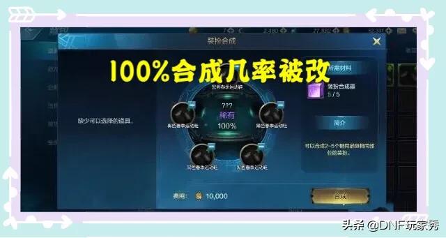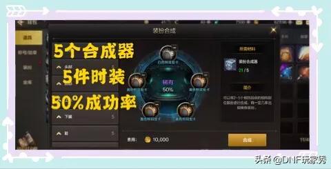 (3)玩家可以用2个合成器,把相同部位的两件时装进行合成,这和端游一样,系统会明确告知合成成功率为20%。如果觉得自己是欧皇的,可以选择这种合成方式,一次合成的成本为60元。