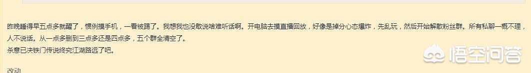 昨晚睡得早五点多就醒了,惯例摸手机,一看被踢了。我想我也没敢说啥难听话啊。开电脑去摸直播回放,好像是掉分心态爆炸,先乱玩,然后开始解散粉丝群。所有私聊一概不理,人不说话。从一点多删到三点多还是四点多,五个群全清空了。