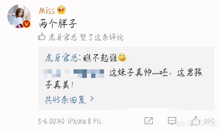③miss作为虎牙一姐,她的回应一般都是经过虎牙的。像之前韦神来到虎牙,miss就曾代表虎牙欢迎他。还有miss发布虎牙永不欠薪的事情,都是虎牙的一个决定而已。这次在官总的这一条微博下面有了miss的回应,虽然只有四个字“两个胖子”,但是很有可能是经过虎牙同意了的,也就是蛇哥回归虎牙有望。