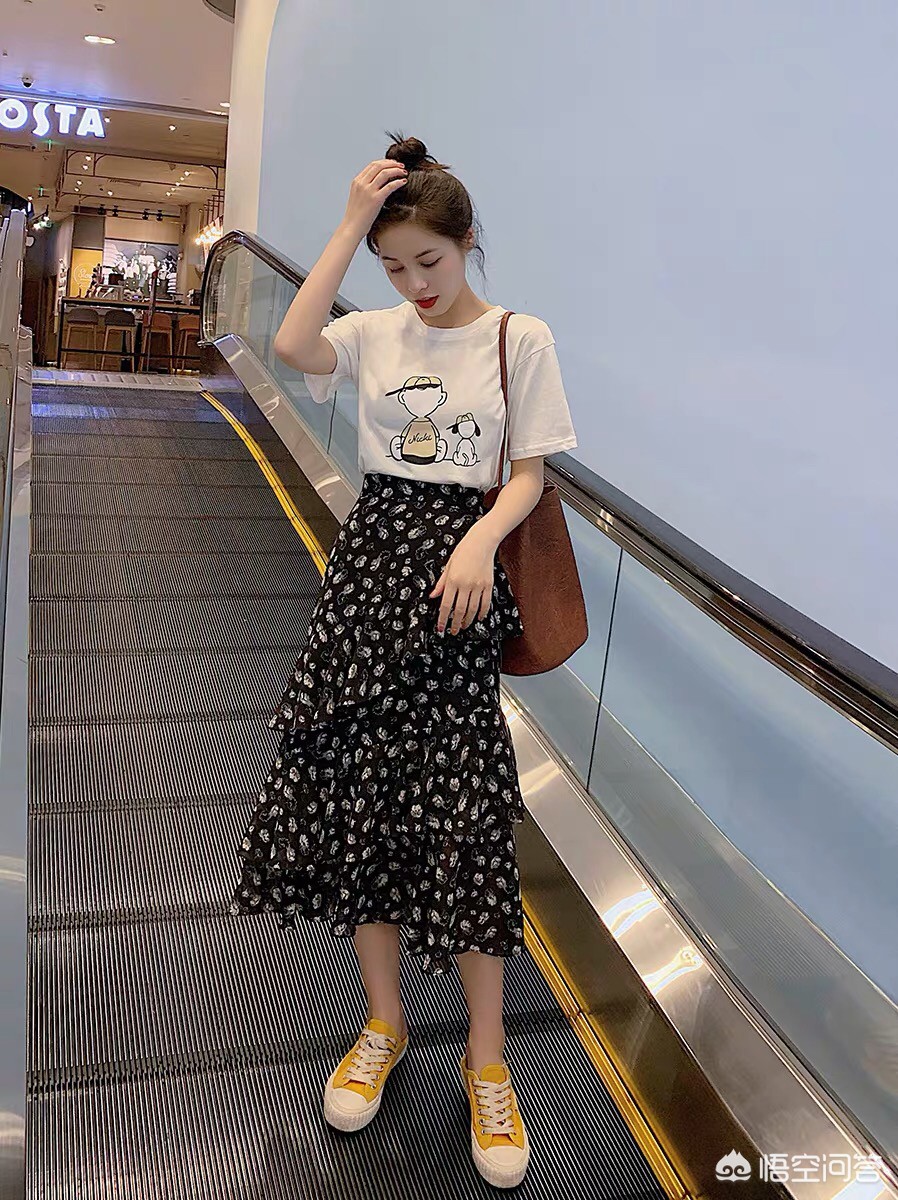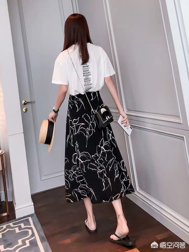 黑色碎花裙+黑色T恤