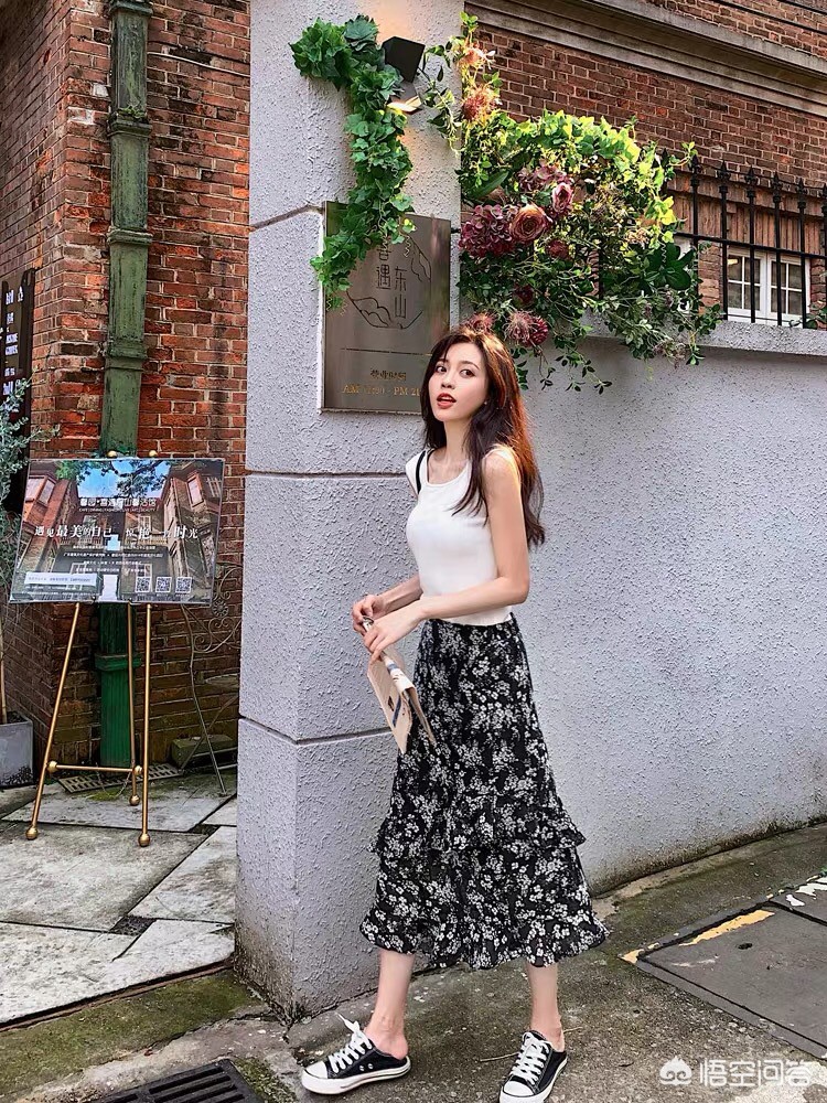 首先,可以在里面搭配一件白T,黑白搭配本来就是经典,况且碎花裙本来就复杂,再搭配一件简单的白色,定是好看了!
