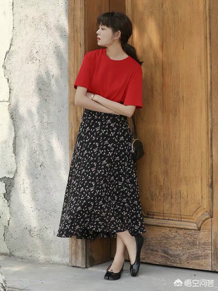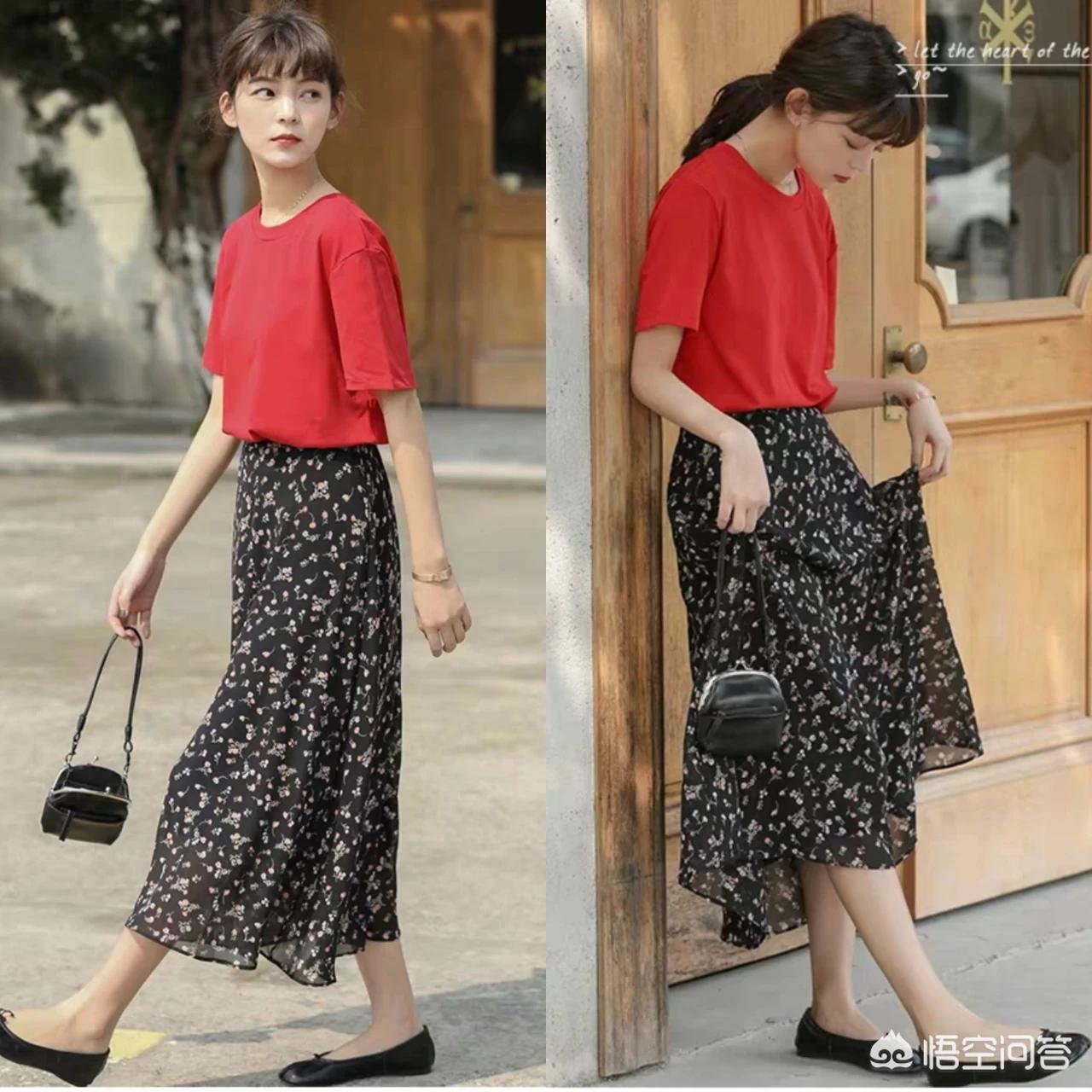 黑色碎花裙+红色T恤