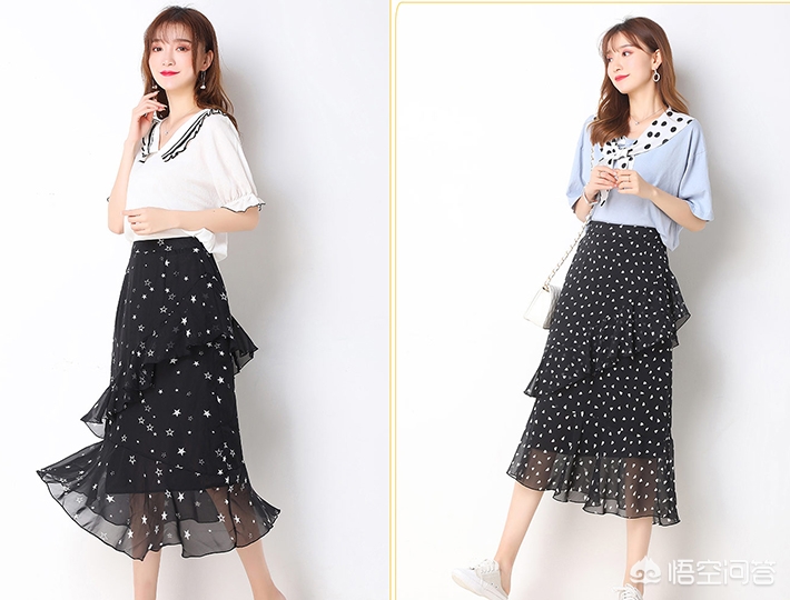 搭配图左这种白色雪纺衫,黑色花边领和裙子呼应,裙子的白色星星印花又和上衣呼应,搭配很是和谐~搭配图右浅蓝色雪纺衫,清新自然~约会装就是这套了!