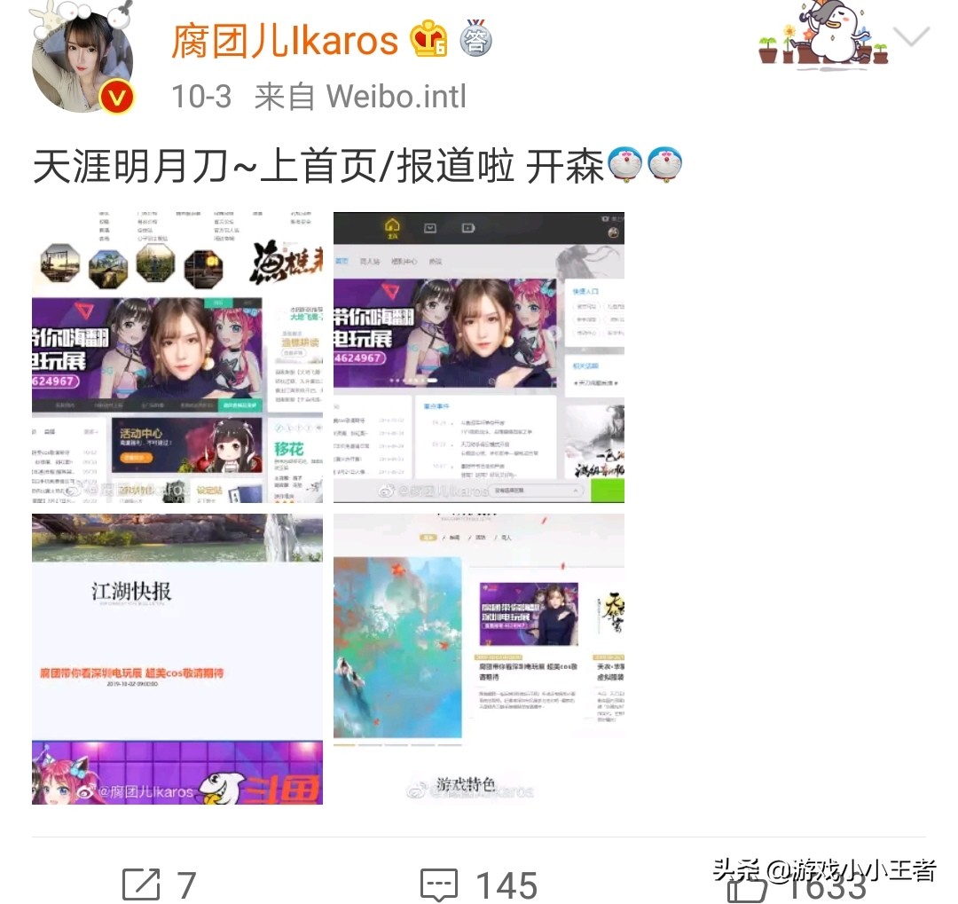 其实这也是腐团儿代言了天涯明月刀后首次为这个游戏宣传。在10月3号的时候,腐团儿就在微博上发言,表示自己上了天涯明月刀的首页,这一种可能就是天涯明月刀已经和腐团儿合作,找她代言了。所以这次腐团儿这样打扮也应该是天涯明月刀官方的要求。