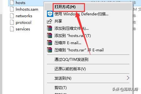 3、右键单击hosts文件选择打开方式,如下图所示。