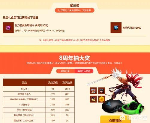 6周年的奖励提高了代币券的数量,还加入了强化劵、黄金增幅书等奖励,在线还有概率获得实体大奖,最好的奖励是苹果5S手机,数量有10个,不知道有没有人真的中奖呢。