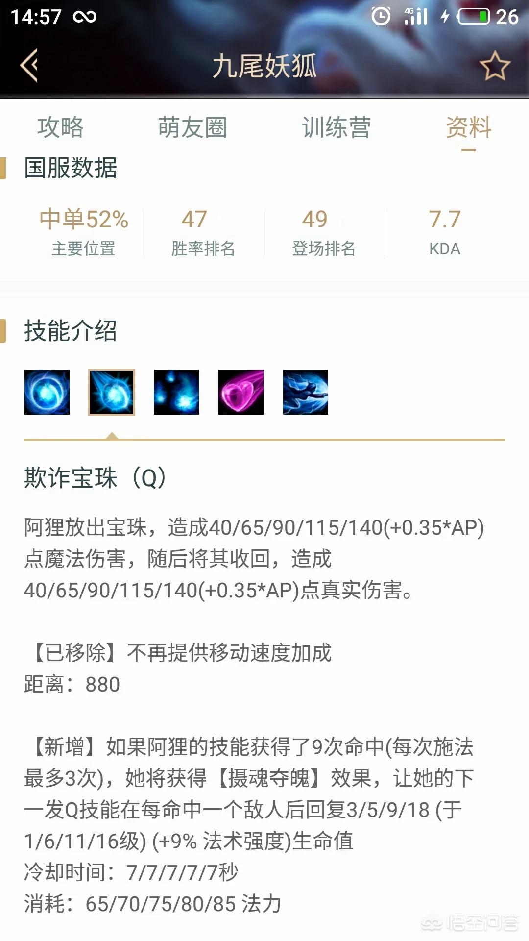 再说q技能,中间有过那么一次改动就是q技能弹道飞行期间,阿狸还有一个急速下降的移速加成,现在和被动互换,被动为技能1.5秒内两次命中敌方英雄触发稳定移速加成。