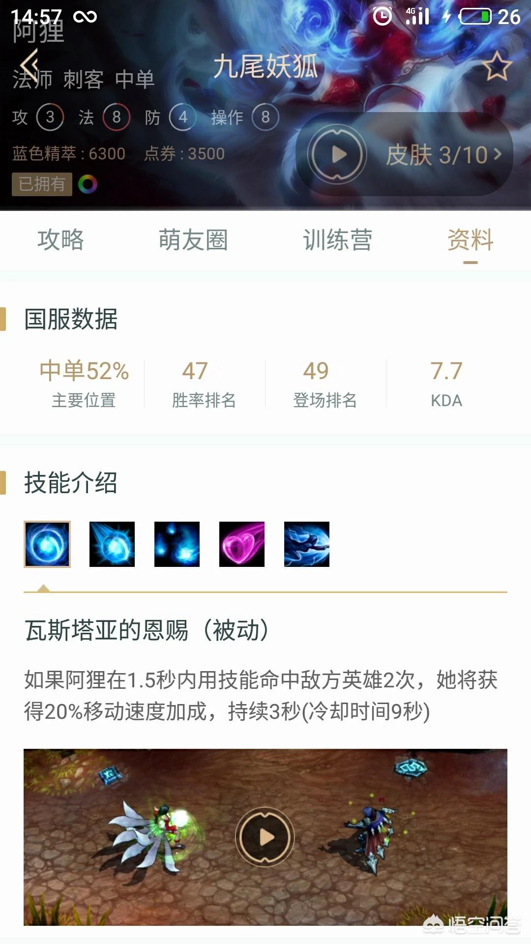 被动早期狐狸是技能命中敌人将会进行摄魂夺魄,每个技能最多叠加三次,九层后的下一次技能将会根据命中单位回复生命。这里就有一个大难点,就是九层后,可能因为各种情况导致e技能触发被动,回血少续航能力不强。