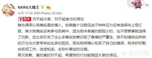 而原LGD杭州主场的主持人NARA,也在这篇官方处罚发布的第一时间,于自己的微博上向全体信任她的人道歉并深刻反思了自己的错误