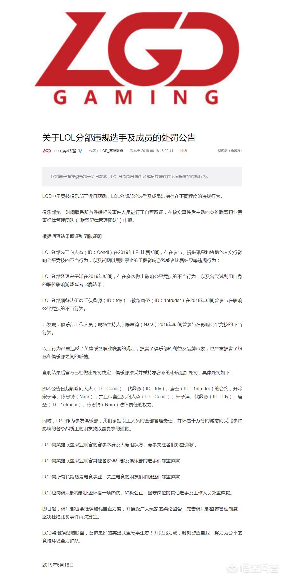 本次LGD假赛事件还要从LGD公布首发名单说起,在首发名单中并没有Condi,再加上网曝Condi假赛,所以引起了玩家的关注。Condi第一时间回应表示并没有打假赛,只是在NEST杯上买了博彩,之后被要挟打假赛,自己不愿意所以上报赛事官方接受调查。但是在下午官方处理公告发布之后,Condi的这套说辞惨遭打脸。在官方公告中,明确表示Condi在LPL比赛期间违反了比赛规则,直接被禁赛18个月,宣告着其职业生涯的结束。除了Condi之外,战队经理以及预备选手fdy和教练1ntruder同样因参与假赛被禁赛,同时主场主持人nara被开除。