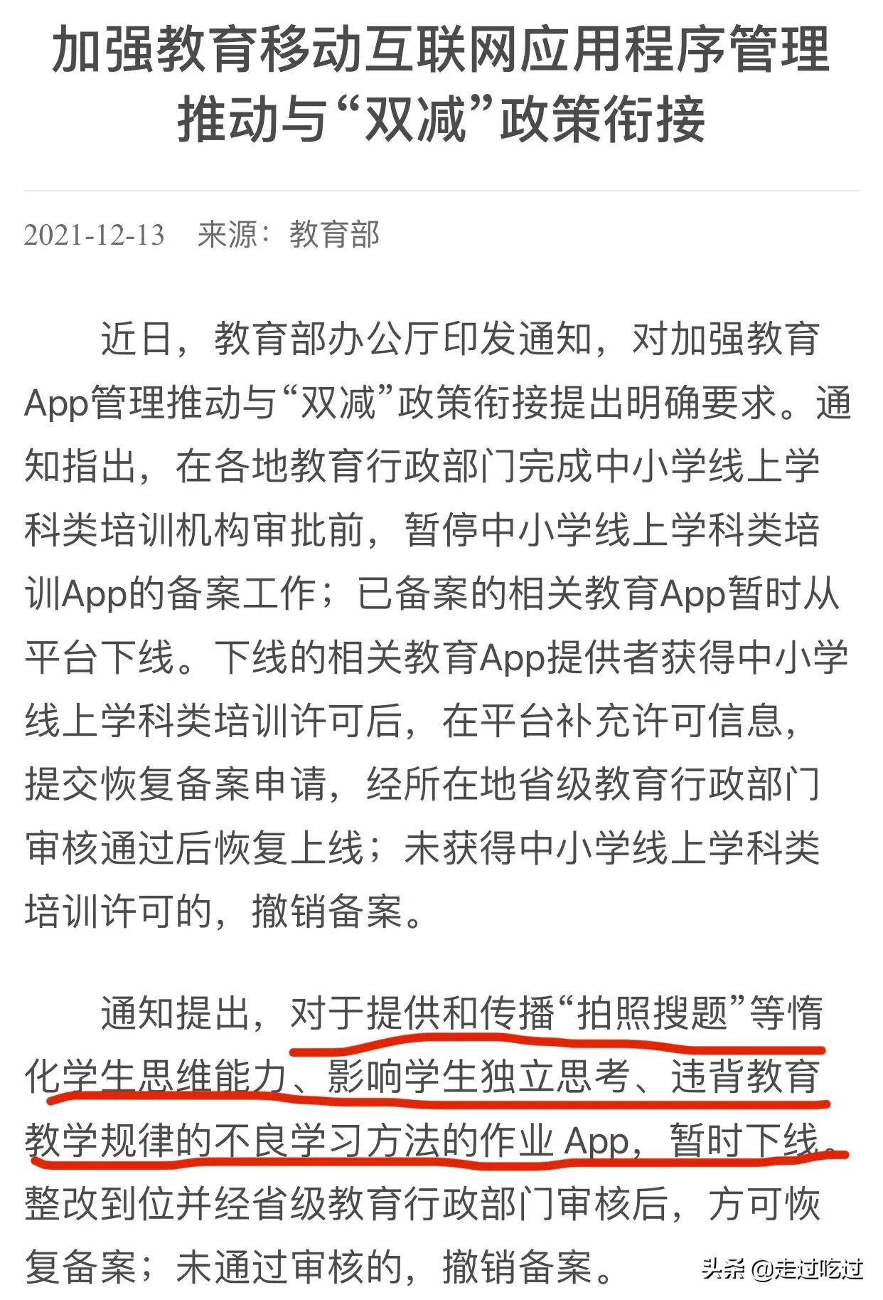 通知提出,对于提供和传播“拍照搜题”等惰化学生思维能力、影响学生独立思考、违背教育教学规律的不良学习方法的作业 App,暂时下线。整改到位并经省级教育行政部门审核后,方可恢复备案;未通过审核的,撤销备案。