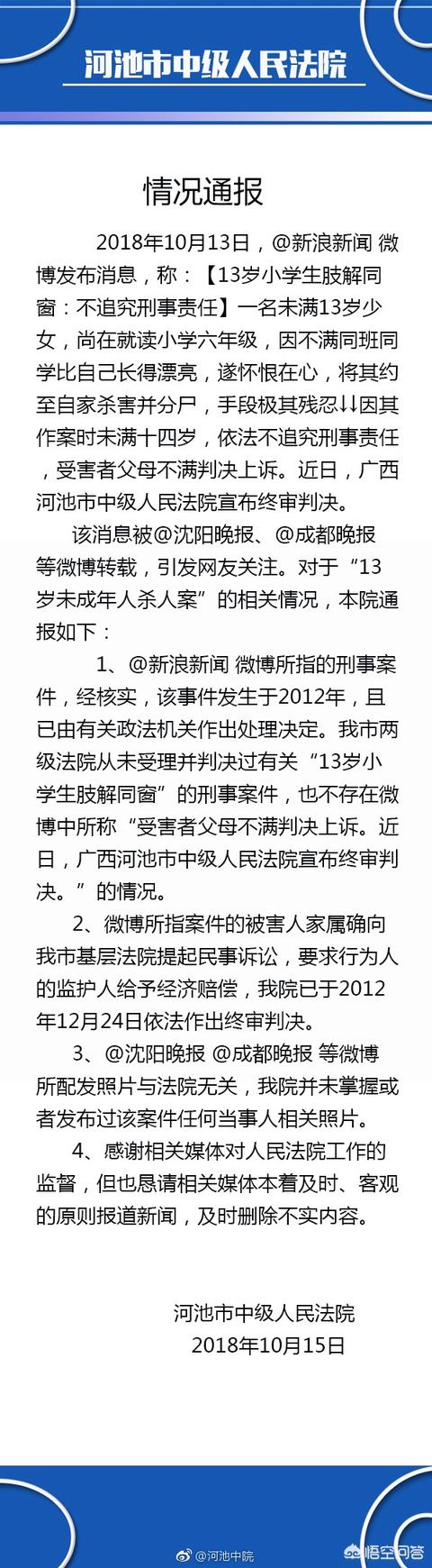 13岁少女肢解同窗好友,河池中院今日发通告:六年前的锅法院不背,不追究刑事责任跟法院没关系!