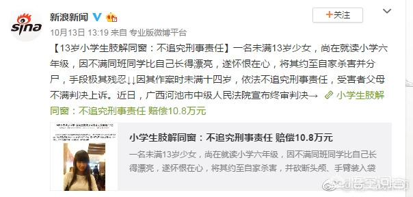 这次曝了的新闻标题是这样的“13岁小学生肢解同窗:不追究刑事责任”,然后报道中就写到“近日河池中院宣判:小学生肢解同窗,不追究刑事责任,赔偿10.8万元”!我只能记者要么是坏,要么是法盲。故意把12年刑事案件和18年民事案件混在一起制造炸眼的效果。