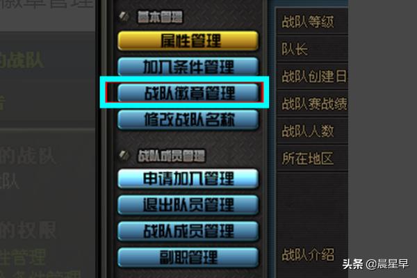 4、 屏幕上除了显示本战队的各种信息以外,还有左边一栏重要的功能按钮。其中有一个就是【战队徽章管理】。