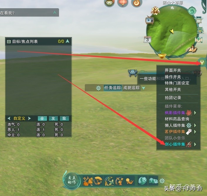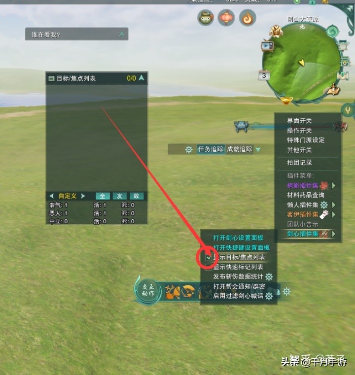 先打开你小地图右侧的小扳手,在里面找到剑心插件,在显示目标前面勾选