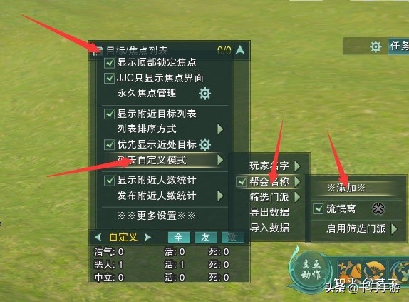 然后点击目标/焦点列表左侧的图标,找到自定义模式,勾选帮会名称,添加你想焦点的帮会。甚至可以启用下面的筛选门派只焦点特定门派。