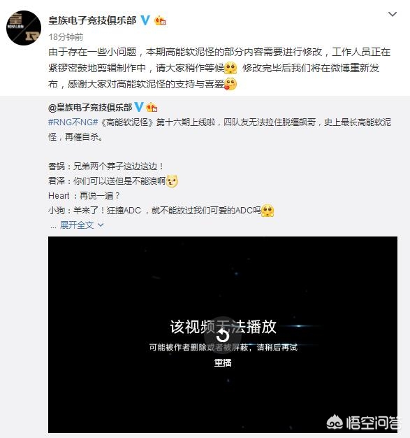 不过在今天下午2点左右,这个视屏就遭到了RNG官方的下架,并表示:由于存在一些小问题,本期高能软泥怪的部分内容需要进行修改,工作人员正在紧锣密鼓地剪辑制作中,请大家稍作等候。 修改完毕后我们将在微博重新发布,感谢大家对高能软泥怪的支持与喜爱。