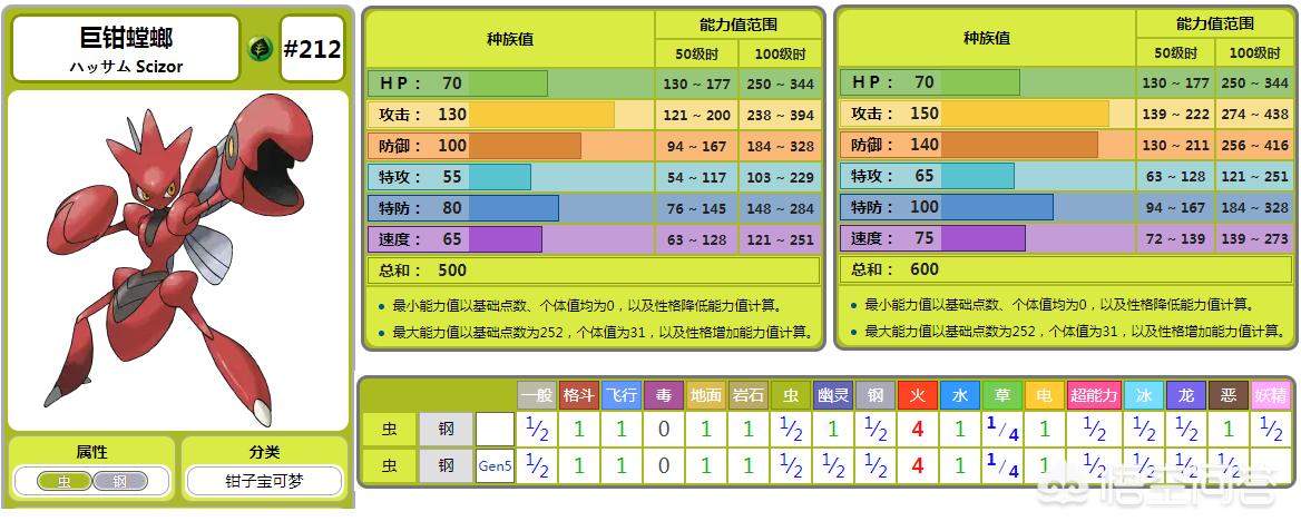 虽然初始种族值一样,但是分布略有差别。仅仅从这上看其实还是飞天螳螂优势更大一些,毕竟速度快意味着更先出手。但是再看属性,飞天螳螂的虫飞行完全被巨钳螳螂的虫钢碾压啊,看看属性相克表,你就一目了然了吧。再加上MEGA进化。。。技能除了飞行系的巨钳螳螂没有,其他的都一样。但是飞行系有什么好用的技能吗?小白觉得也就一个飞天可以看看,其他的没啥用啊,完全不如钢系实用。。。其他的还有什么要说的么?