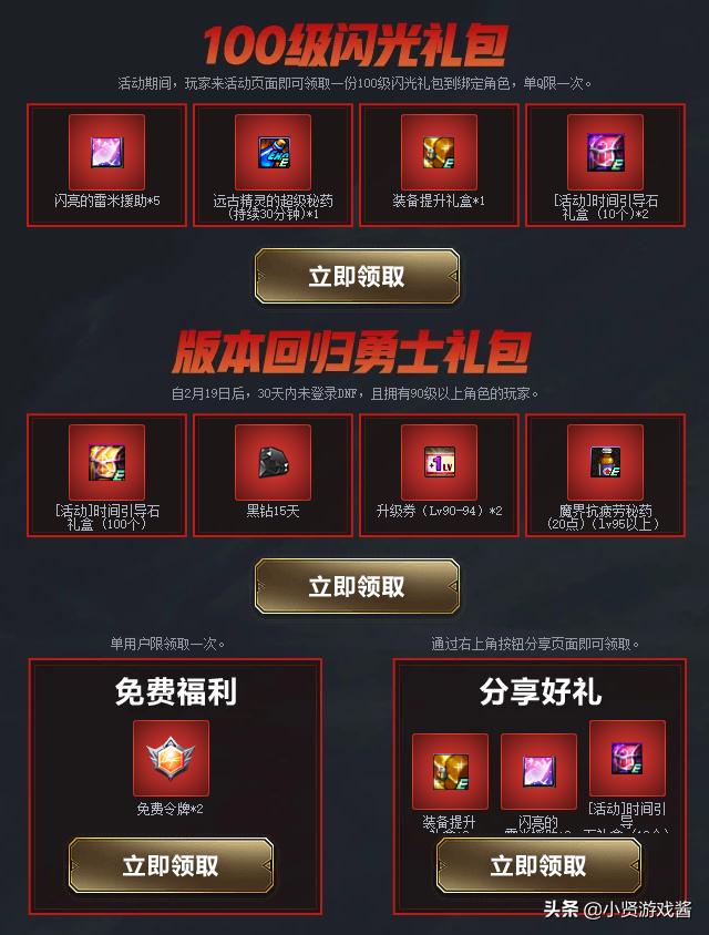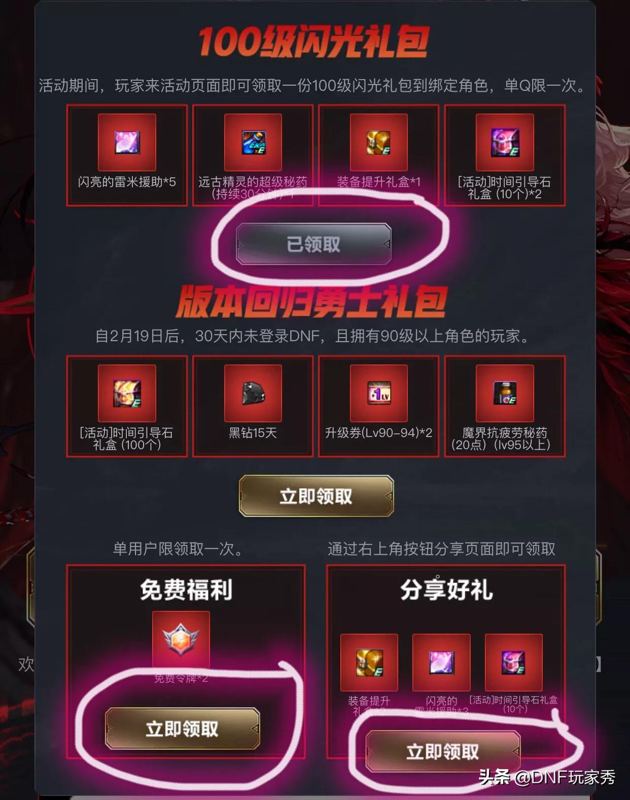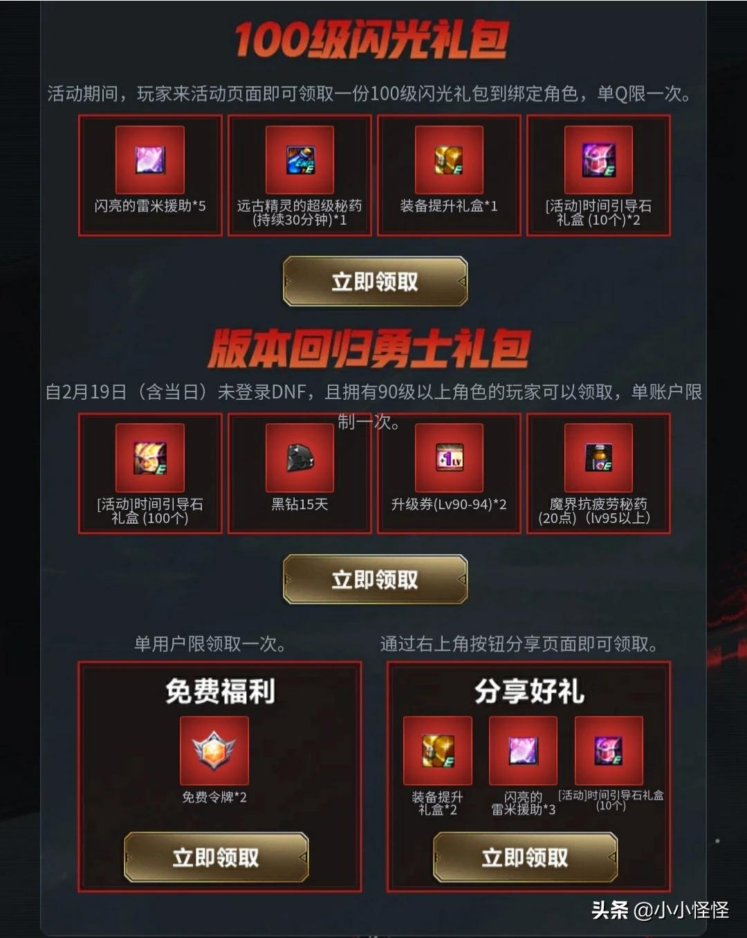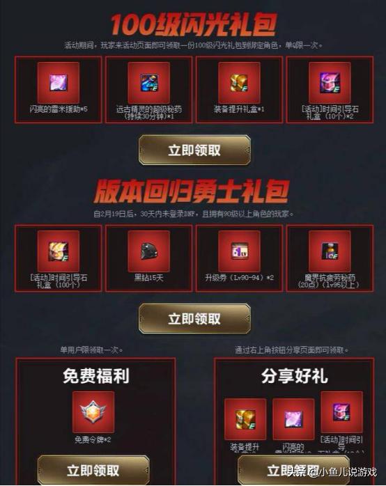 (1)进入页面就有一个“100级闪光礼包”,登录绑定角色就可以领取!领取后下面还有两个奖励,不要错过!