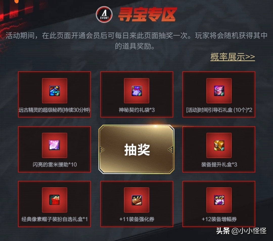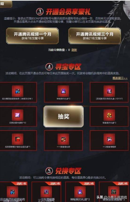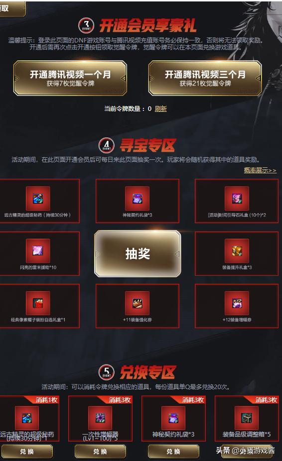 另外由于该活动是联名腾讯视频VIP的原因,也开放了开通vip会员获得觉醒令牌的材料,并且开通之后还有抽奖的奖励,玩家在开通腾讯视频VIP之后可以进行抽奖,其中最好可以抽到+12装备增幅卷,另外玩家也可以通过觉醒令牌来兑换其他奖励,在这其中也包含PL药。