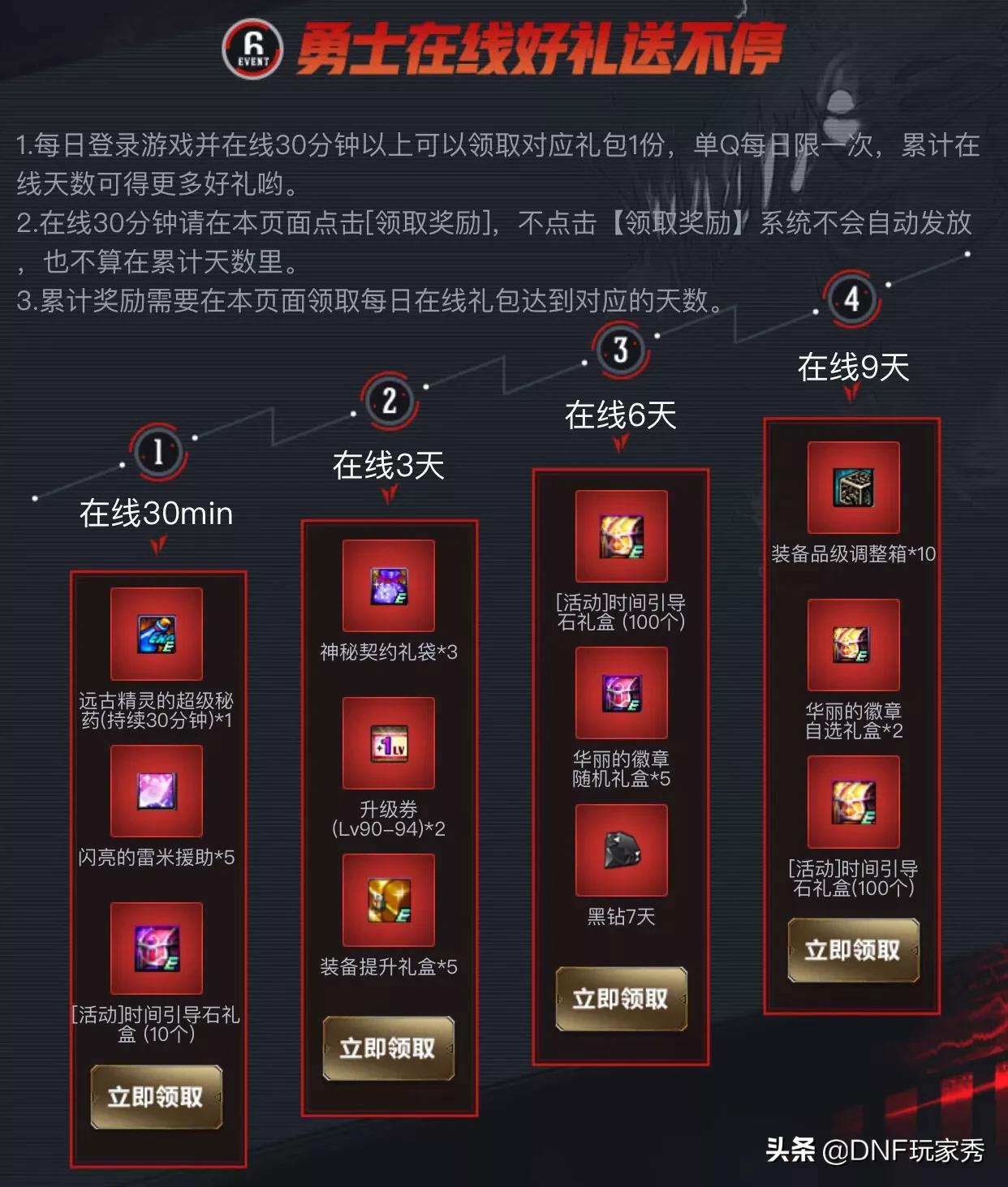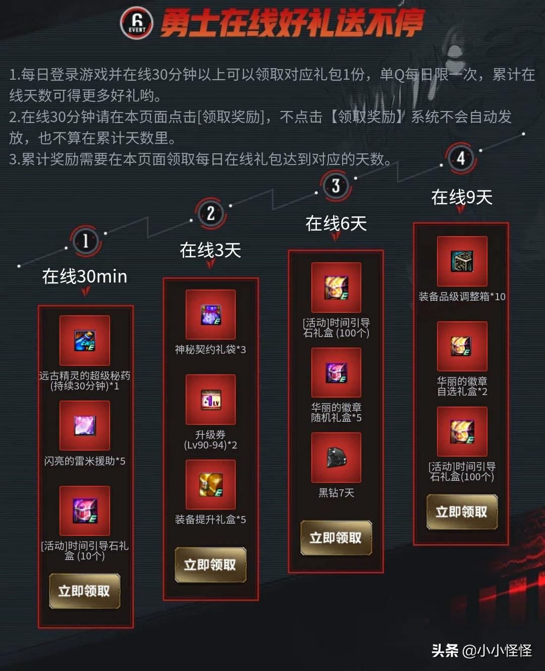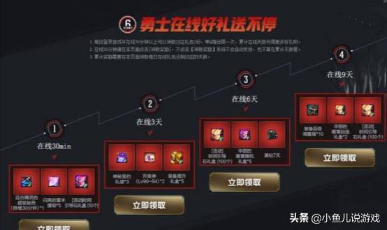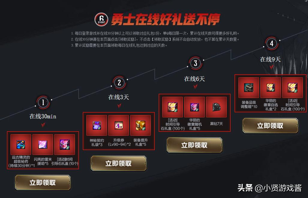 其次就是每天的在线奖励了,每天在线30分钟就可以领取一个奖励了,和以前的活动一样,累积3天,6天和9天的奖励,这里的奖励还是非常不错的,有升级券,引导石和黑钻等奖励,主要是不需要做什么前置任务,只要在线时间够了就可以了。