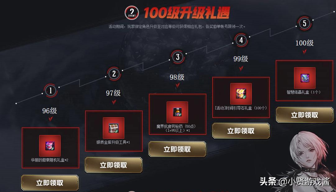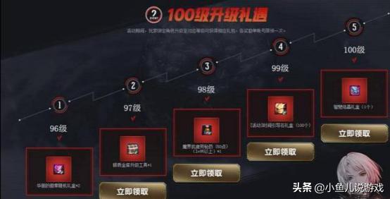 这个是升级活动,可以看到从96级-100级每个等级都会送大家一些奖励,其中就有50点疲劳药的奖励,这样正好弥补一些玩家疲劳药不多的情况,不过需要升到98级才可以领取,后续深渊也是可以用的。