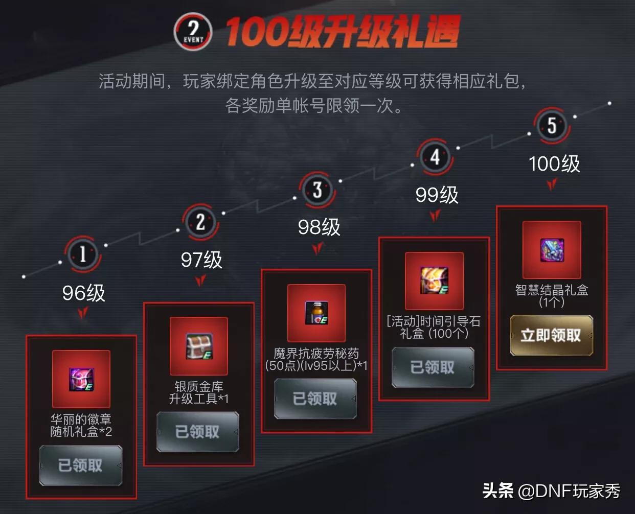 DNF100级升级礼遇活动来袭,达到98级可领取50PL,登陆即可获得100级闪光礼包,如何