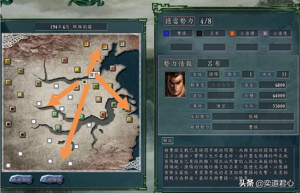 另外用吕布在这个剧本里面横冲直撞也非常过瘾。往西边强刚曹老板,北边找颜良文丑打架,东边刘关张不好对付,绕过去欺负孔融抢他梨,或者也直接搬家到南边欺负刘表。