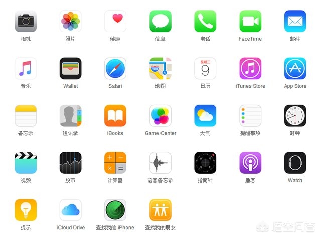 可删除的有:FaceTime、邮件、音乐、地图、日历、iTunes Store、备忘录、通讯录、iBooks、Game Center、天气、提醒事项、视频、股市、计算器、语音备忘录、指南针、播客、Watch、提示、iCloud Drive、查找我的朋友、Apple Store、遥控器