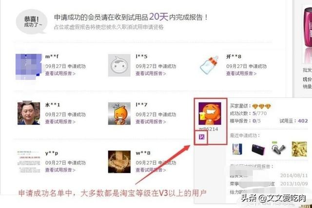 3、提升淘宝账号的等级。随便点开一个使用申请结束的产品就能看到,申请成功的账号绝大部分淘宝等级都在V3以上。所以我们想在淘宝试用中心成功申请到试用品,还要特殊关注一下自己账号的淘宝等级。一般来说,淘宝等级V2-V3就有机会获得试用品,只是几率会低一点,V4以上就高很多了。