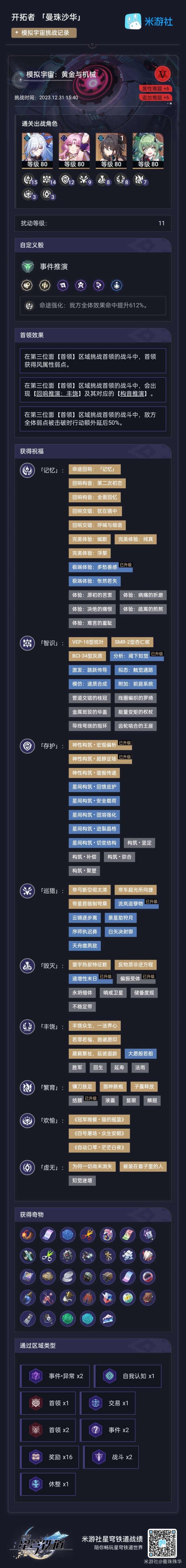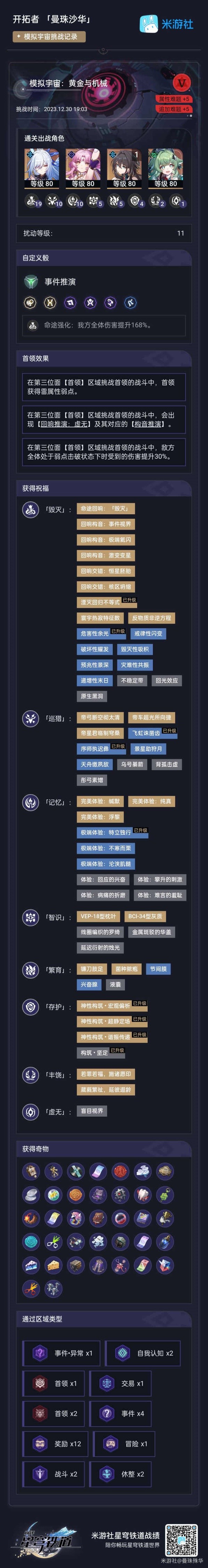 难题十二,一次过,但这次着实是有些运气成分,九大命途27个三星,我拿了25个,其中毁灭的不等式刻意没要,还有个虚无的三星不知道为什么一直刷不出来。当时打的时候,第二位面结束就已经拿了25个了,第三位面用福灵胶杀了三只猪,甚至把超验之镜打了,都只刷出毁灭不等式,找不到那个虚无,不知道是不是因为我把虚无命途禁了,然后其他三星不拿完它就不出来……此外外加33个奇物,纯美红剪刀照旧。