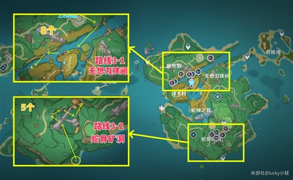 ▶路线3八酝岛采摘:13个(无想刃狭间8个、蛇骨矿洞5个)