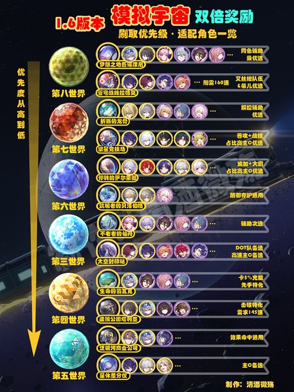《崩坏星穹铁道》1.6版本将开启模拟宇宙双倍奖励活动,那么玩家们可以优先刷哪些装备呢?请看下面由“清酒微殇”带来的《崩坏星穹铁道》1.6模拟宇宙双倍活动刷取优先级,希望对大家有用。