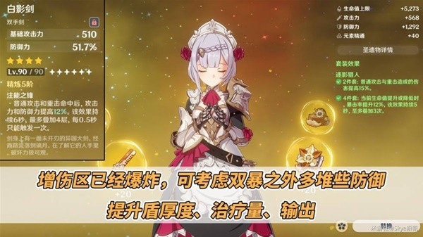 配装建议:若满足前面条件,可以考虑直接猎人套(防防暴)+白影剑(若有条件可以赤角)。因为夜兰与芙宁娜提供了极高增伤,诺艾尔也没必要去死磕岩伤杯,同时防御力可提高治疗量与护盾盾量,提高为芙宁娜增伤叠层速度,同时避免战技盾破裂影响治疗的触发。此外如果你整个配队练度较低,深渊需要打较多轮循环,此时诺艾尔建议充能沙。