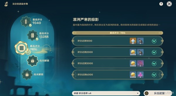 对于其它角色练度普遍不高的情况下,建议选择2倍积分倍率,靠着试用角色娜维娅拿满3000分挡位比较轻松。其它角色练度高,就选4倍积分倍率