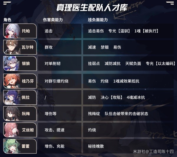 我们可以构建一个真理医生配队“人才库”,列出能够辅助真理医生上述机制特点的角色。